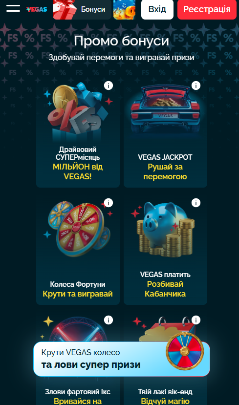 Реєстрація у Vegas.ua – офіційний гід 2026 Опубліковано на 19 February 2026 Матеріал носить інформаційний характер. Vegas.ua — ліцензований оператор з дозволом КРАІЛ №512.Редакція Viche.info не пропонує азартні ігри, а лише інформує про офіційні умови реєстрації. Регулятор: Комісія з регулювання азартних ігор та лотерей (КРАІЛ). Ліцензія: №512 від 2024 року, дійсна для онлайн-казино Vegas.ua. Відповідальна гра: 21+. Грайте свідомо. Vegas.ua — ліцензоване онлайн-казино України з дозволом КРАІЛ №512 від 2024 року. Реєстрація займає лише кілька хвилин, а нові гравці отримують щедрий вітальний пакет: до 15 000 ₴ бонусу та фріспіни. У цьому гіді ми розкажемо, як створити акаунт, активувати бонус, вибрати кращі ігри і чим відрізняється Vegas.ua від інших казино в Україні. Vegas.ua — коротко про головне: Офіційний домен: vegas.ua Ліцензія: КРАІЛ №512 (онлайн-казино) Мінімальний депозит: від 100 ₴ Верифікація (KYC): обов’язкова перед виведенням Час виплат: зазвичай до 24 годин Підтримка: онлайн-чат 24/7 📝 Як зареєструватися у Vegas.ua Процес реєстрації простий і доступний для всіх користувачів з України: Перейдіть на офіційний сайт Vegas.ua. Натисніть кнопку «Реєстрація» у верхньому правому куті. Заповніть форму: e-mail, пароль, вибір валюти (₴ / $). Підтвердіть номер телефону або e-mail. Після реєстрації автоматично активуються фріспіни (якщо є) та бонус при першому депозиті. Внесіть мінімальний депозит (зазвичай 100 ₴) — бонус зараховується одразу. 🎁 Бонус при реєстрації та фріспіни Vegas.ua пропонує новим гравцям вітальний пакет із двох частин: 💰 Бонус на перший депозит — 150% до 15 000 ₴ 🎰 Безкоштовні фріспіни (кількість залежить від акції) Бонуси відіграються з вейджером x35 для коштів, x30 для фріспінів. На акцію дається до 7 днів для відіграшу. 💳 Методика оплати та виведення Метод Мінімум Час обробки Visa / Mastercard 100 ₴ Миттєво Monobank / Приват24 100 ₴ до 5 хвилин Apple Pay / Google Pay 150 ₴ Миттєво Виведення від 200 ₴ до 24 годин 🛂 Верифікація (KYC) у Vegas.ua Перед першим виведенням коштів Vegas.ua проводить перевірку особи (KYC). Це стандартна процедура для ліцензованих казино України. Фото або скан паспорта / ID-картки Підтвердження адреси (за потреби) Підтвердження банківської картки Зазвичай перевірка займає від 30 хвилин до 24 годин. Після успішної верифікації обмеження на виплати знімаються. 🎮 Кращі ігри на Vegas.ua (RTP, відгуки) Редакція Viche.info протестувала ігри з гарним RTP на Vegas.ua. Рекомендуємо такі слоти: ГраПровайдерRTPОцінка гравцівSweet BonanzaPragmatic Play96.48%⭐ 4.8 / 5Gates of OlympusPragmatic Play96.5%⭐ 4.6 / 5Book of DeadPlay’n GO96.21%⭐ 4.7 / 5Elvis Frog in VegasBGaming96.0%⭐ 4.5 / 5 Оцінки базуються на даних віджета відгуків та тестів Viche.info. 🎥 Live Casino на Vegas.ua — гра з реальними дилерами Якщо ти шукаєш атмосферу справжнього казино — секція Live Casino у Vegas.ua створена саме для цього. Ігри проводять професійні дилери у прямому ефірі, а гравці можуть спілкуватися у чаті та ставити в реальному часі. Серед провайдерів — Evolution Gaming, Pragmatic Play Live, Ezugi. Платформа підтримує повну HD-трансляцію, мобільну адаптацію і мінімальні затримки. Live-граПровайдерRTPОсобливостіLightning RouletteEvolution Gaming97.3%Множники до x500, український чатBlackjack AzurePragmatic Play Live99.47%Швидкий темп гри, 7 місць за столомCrazy TimeEvolution Gaming95.5%4 бонус-раунди, ефектне шоуSweet Bonanza CandyLandPragmatic Play Live96.9%Ігрове колесо + фріспіни, кольорова студіяBaccarat SpeedEzugi98.94%Раунди до 30 секунд, мінімальна ставка 20 ₴ Кожна гра сертифікована, а RTP перевірено КРАІЛ та незалежними лабораторіями. Результати виз
